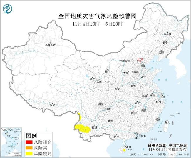 预计,11月4日20时至5日20时,海南中部、云南中部和西部等地部分地区发生地质灾害的气象风险较高(黄色预警)。各级政府及有关部门按照应急预案做好地质灾害防御工作。请社会公众及时关注地质灾害气象风险预警信息,谨慎前往地质灾害预警区域。黄色预警区内人员,请随时关注预警信息变化,注意附近警示标志,避免在沟谷、斜坡、陡崖(坎)等高风险地带逗留。